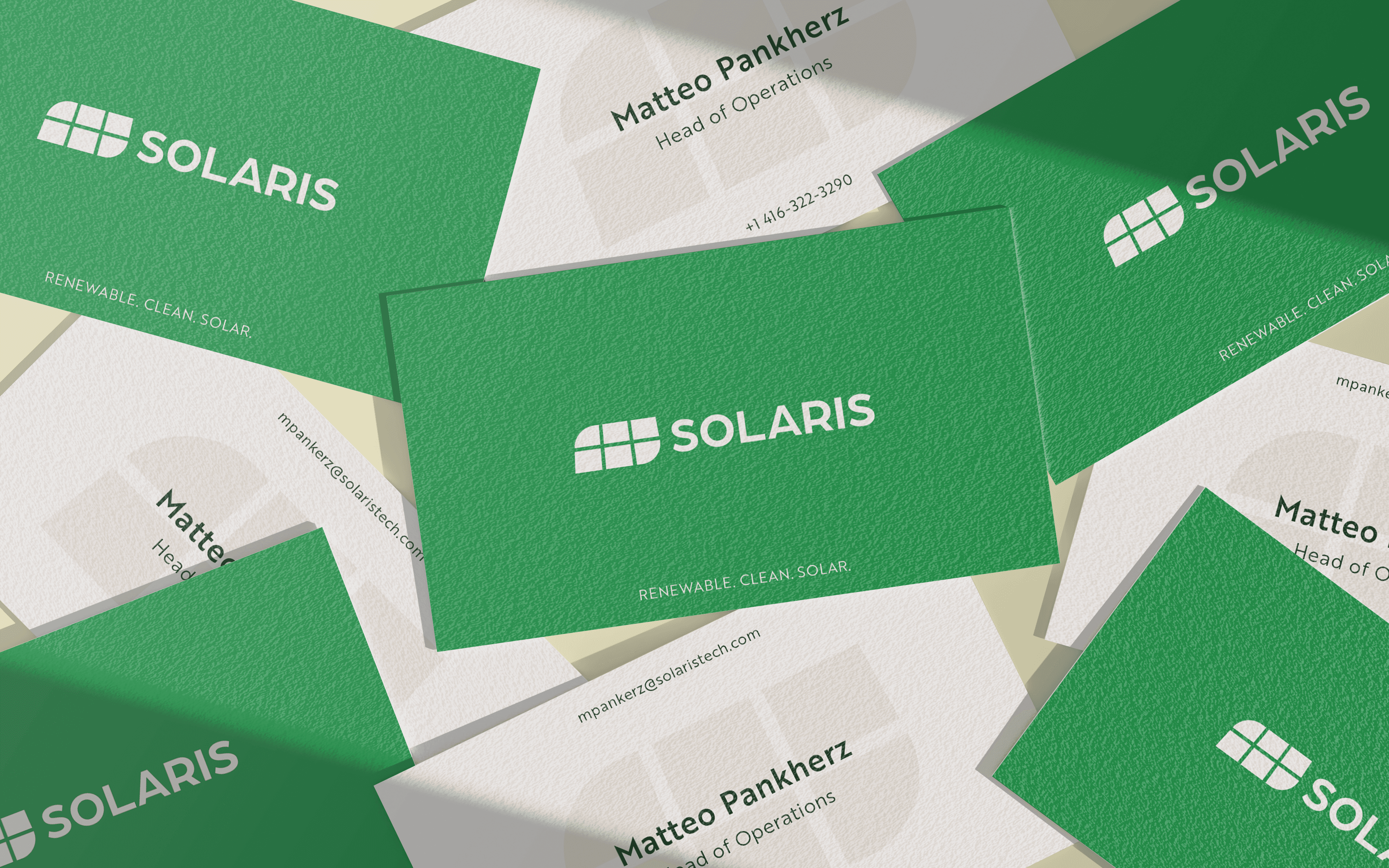 Solaris is a conceptual mockup for a clean energy, solar technology company. For this fabricated company I created a clean, scalable brand system, designed to inspire trust and communicate innovation.